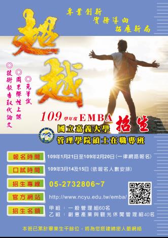 一、上揭招生報名日期自109年1月21日至2月20日下午5時止,一律採網路報名, 招生簡章下載與報名網址:https://admissions.ncyu.edu.tw/www.aspx?webprjno=AAAG。二、該校管理學院碩士在職專班已有逾千名畢業校友,遍佈各行各業且都有傑出的表現,109學年度招收一般管理組60名及創意產業與觀光休閒管理組40名,合計100名。三、本專班整合管理學院豐富且優質的師資,提供多元且兼具理論與實務課程,並採周末上課方式,讓學生得以兼顧工作、學業與家庭;以技術報告取代碩士論文,為在職進修最佳選擇,歡迎非商管或商管科系畢業者報考。