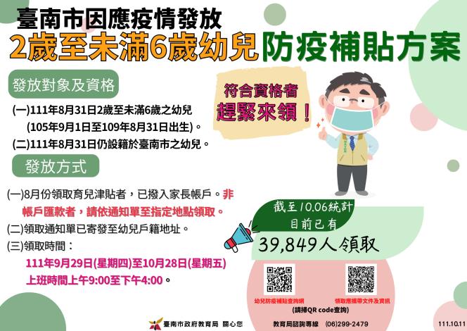 (一)發放對象:105年9月1日至109年8月31日出生,且111年8月31日仍設籍於臺南市之幼兒。(二)發放金額:新臺幣1000元。(三)發放方式:1、帳戶匯款:8月份領取育兒津貼者,已於111年9月29日撥入家長帳戶。2、領取現金:即日起至111年10月28日上班時間上午9:00至下午4:00,至指定地點領取。